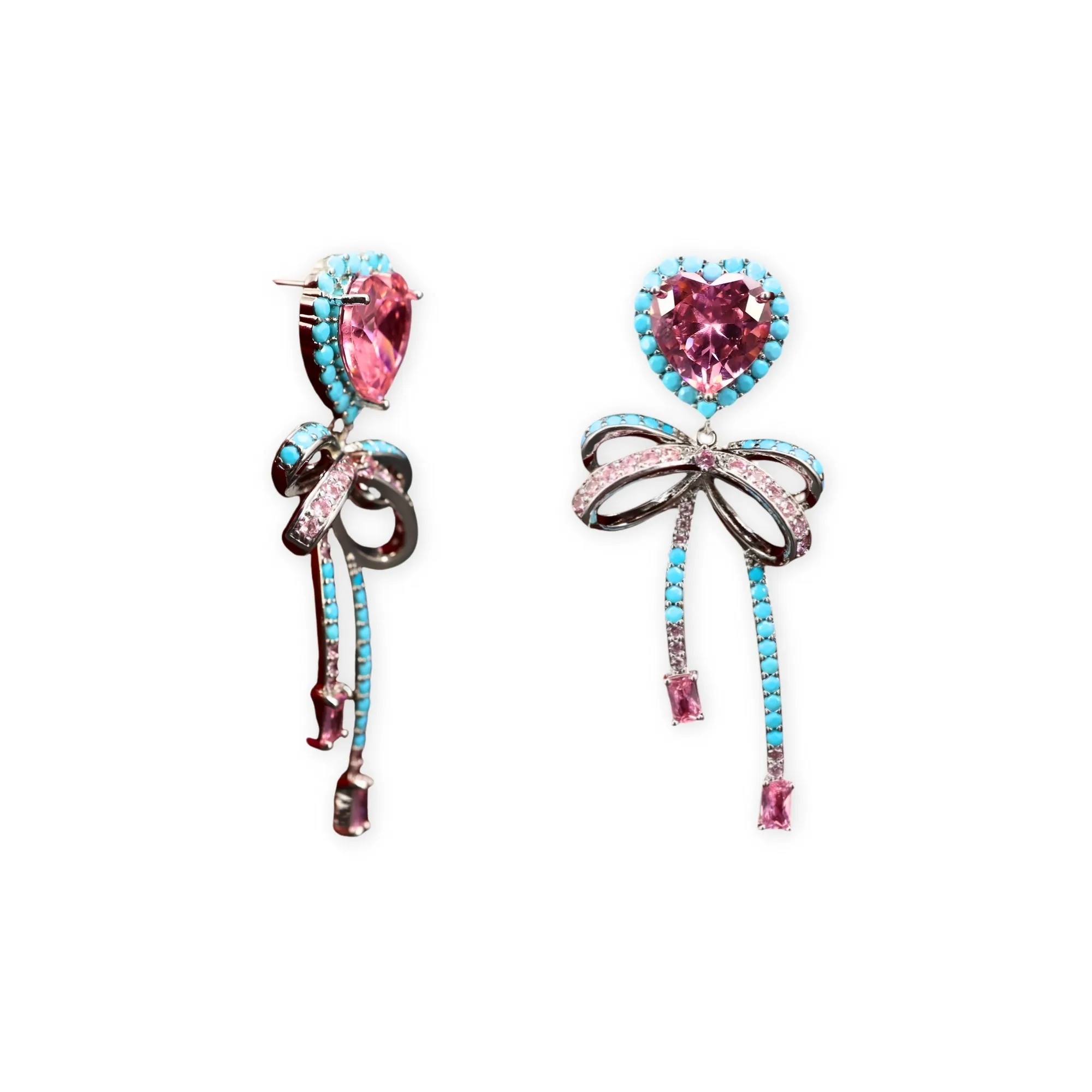 The standout bow-inspired structure adds a graceful flow to the design, allowing the earrings to move subtly with every step. Slender drop elements detailed with turquoise stones and finished with pink accents create balance and visual interest. This thoughtful combination of shape, colour, and proportion makes the earrings eye-catching while remaining easy to style.