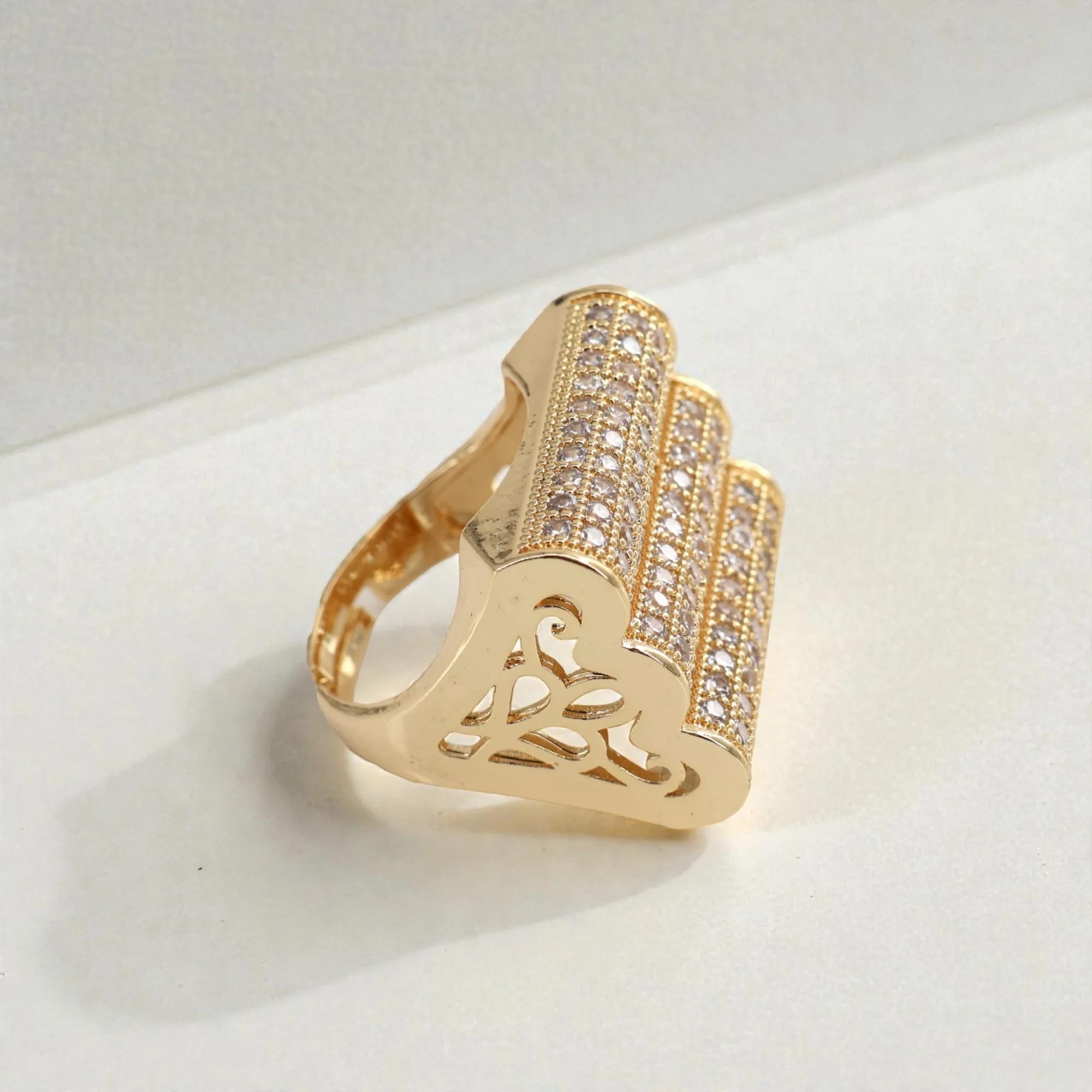 The Rineva Aurelia Gold Radiance Statement Ring is designed to make a confident and elegant impression. Crafted in a rich gold tone, this ring features a striking rectangular top adorned with multiple rows of precisely set cubic stones that deliver exceptional sparkle and depth.