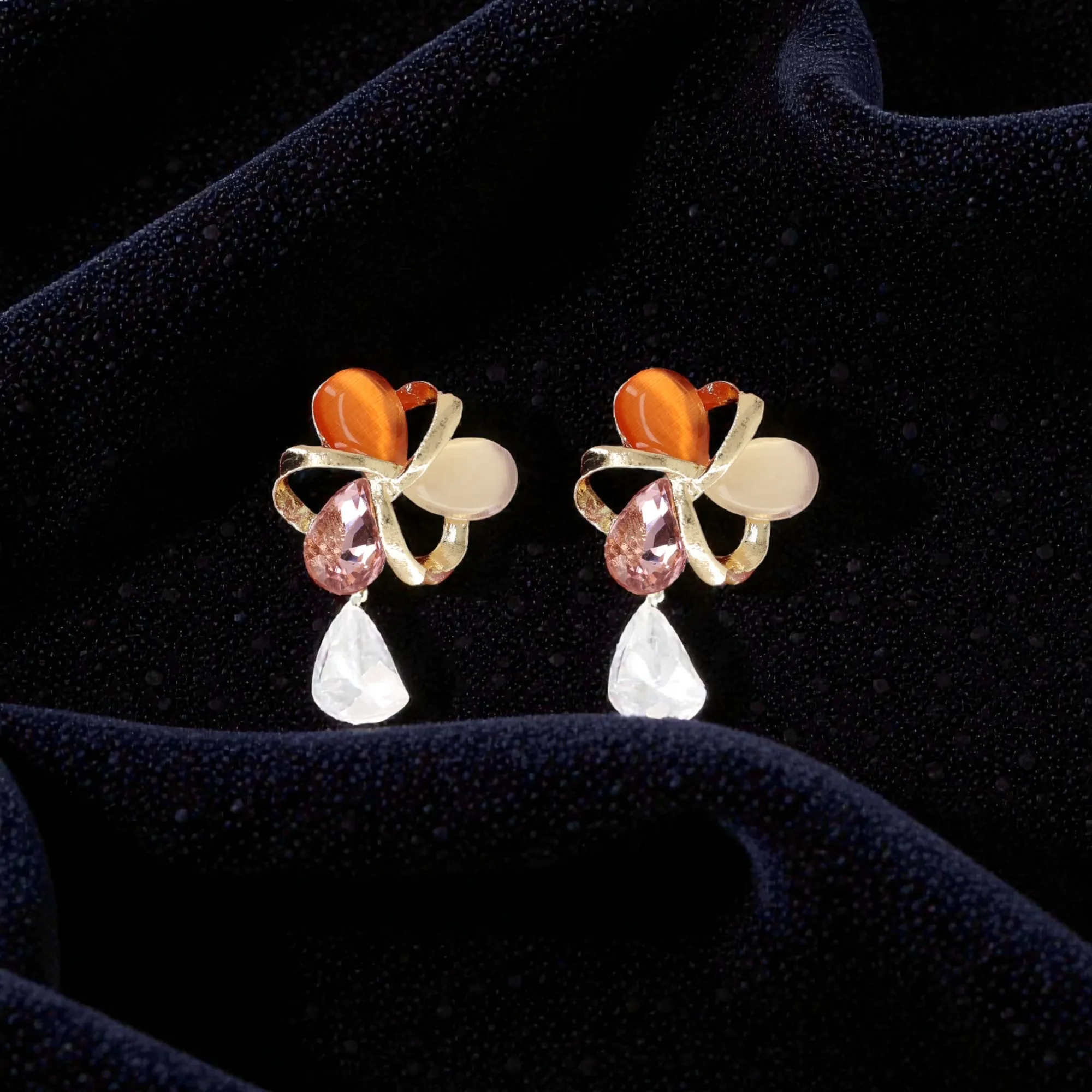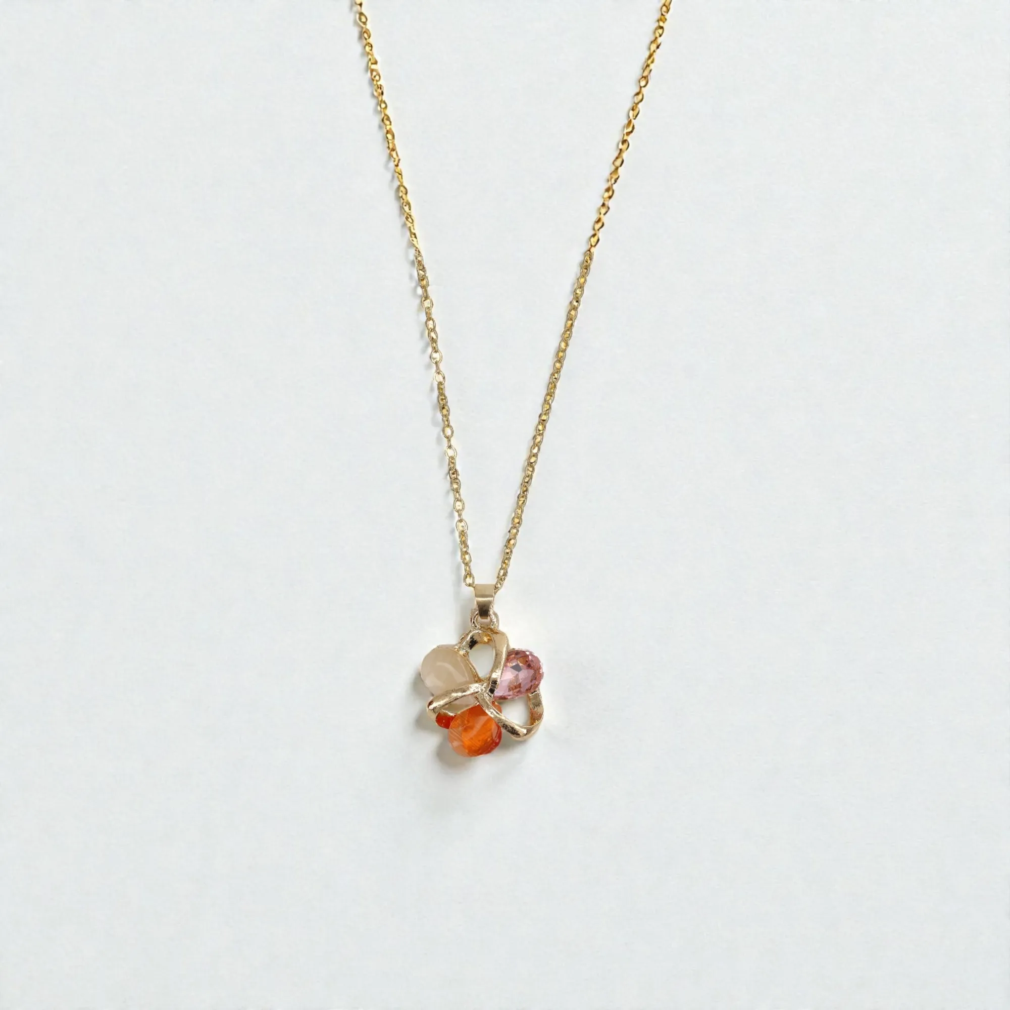 Inspired by blooming petals, both the pendant and earrings showcase a sculptural arrangement of multitone stones in warm amber, blush pink, and ivory hues. The polished gold-tone framework enhances the softness of the stones while adding a subtle glow that complements both ethnic and contemporary outfits.