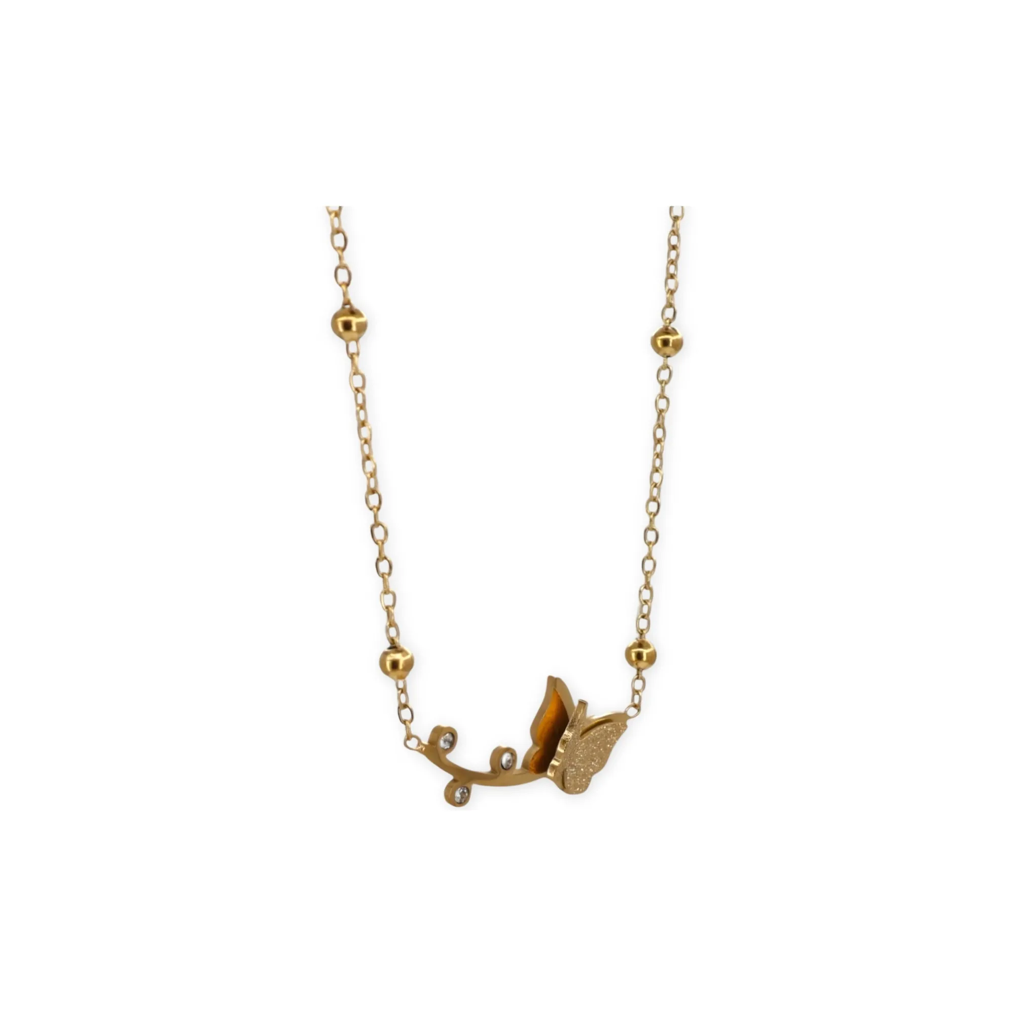 Crafted with a slim gold-tone chain, the design features a delicately textured butterfly motif paired with a softly curved element adorned with fine crystal detailing. The butterfly symbolises transformation and lightness, while the crystal accents add a subtle sparkle that elevates the overall look without making it heavy or flashy.