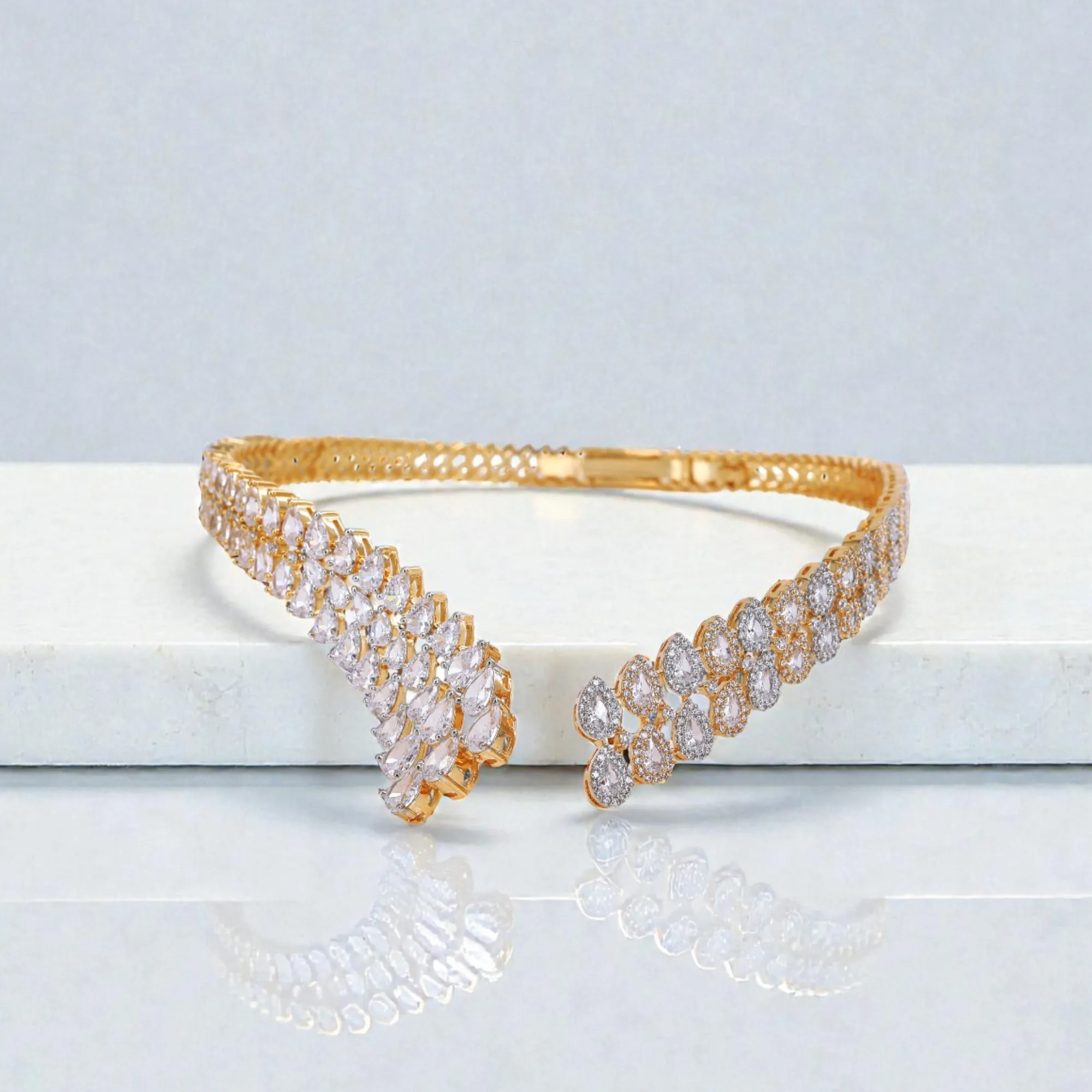 The choker features an intricate leaf-inspired pattern, highlighted with pear-cut and marquise-shaped cubic stones that reflect light with exceptional brilliance. Its curved design sits gracefully along the neckline, adding a touch of glamour without appearing heavy.