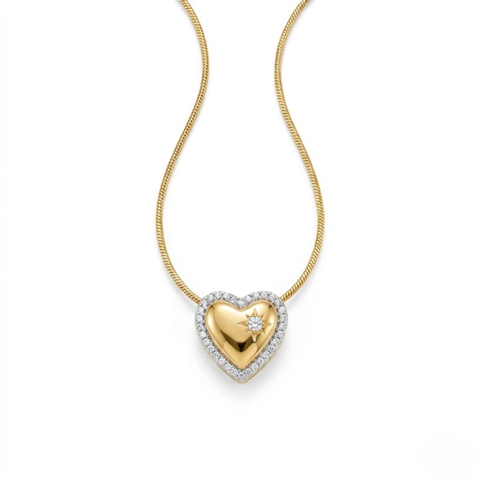 The Rineva Celeste Heart Halo Pendant Necklace is a graceful expression of love and elegance. Designed with a beautifully polished gold-tone heart at the center, this pendant radiates warmth and sophistication.