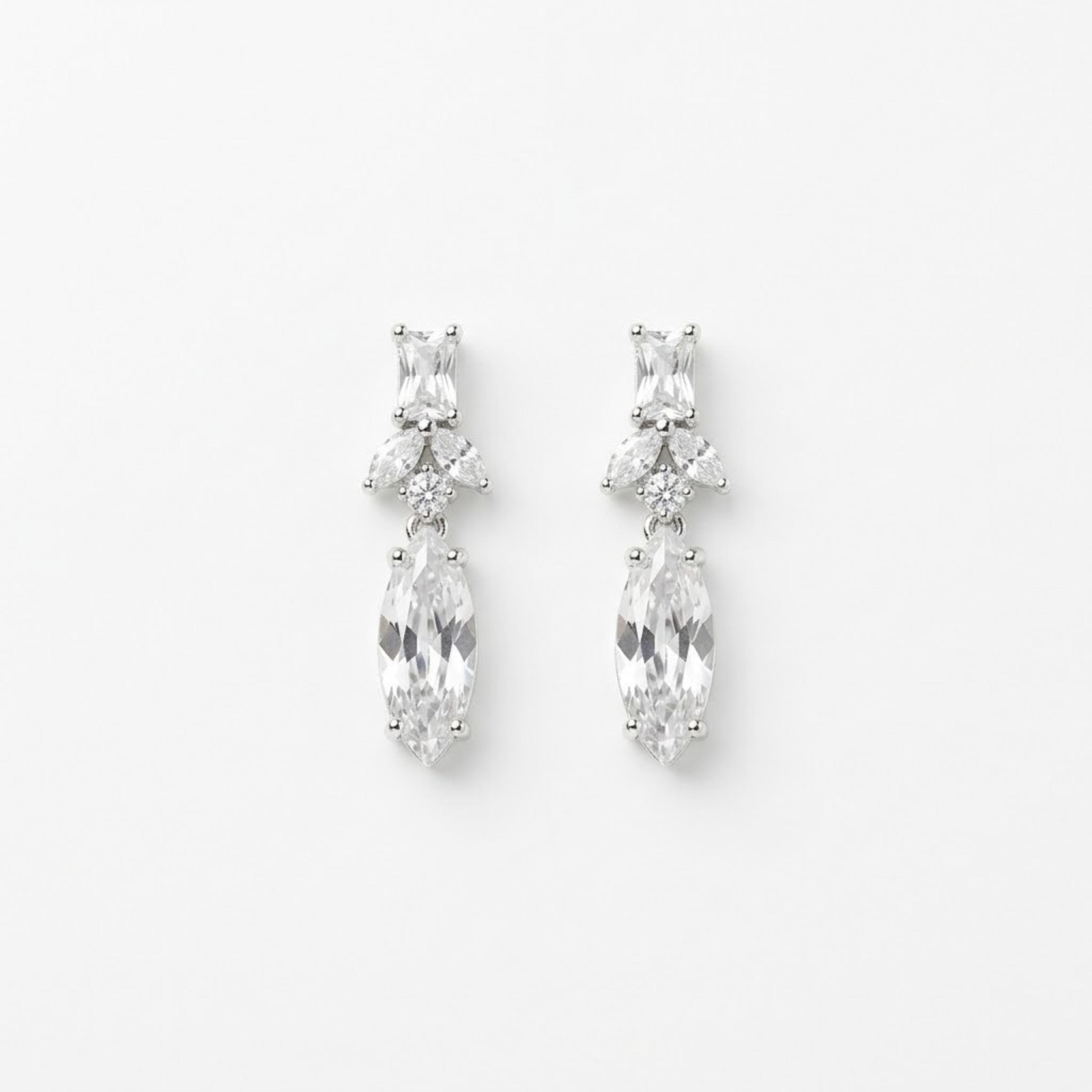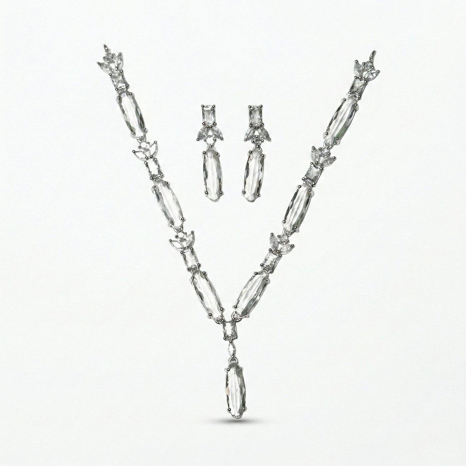 The matching drop earrings mirror the necklace detailing, featuring a balanced combination of structured cuts and delicate brilliance. Together, the set delivers a cohesive and polished look without overwhelming the outfit.