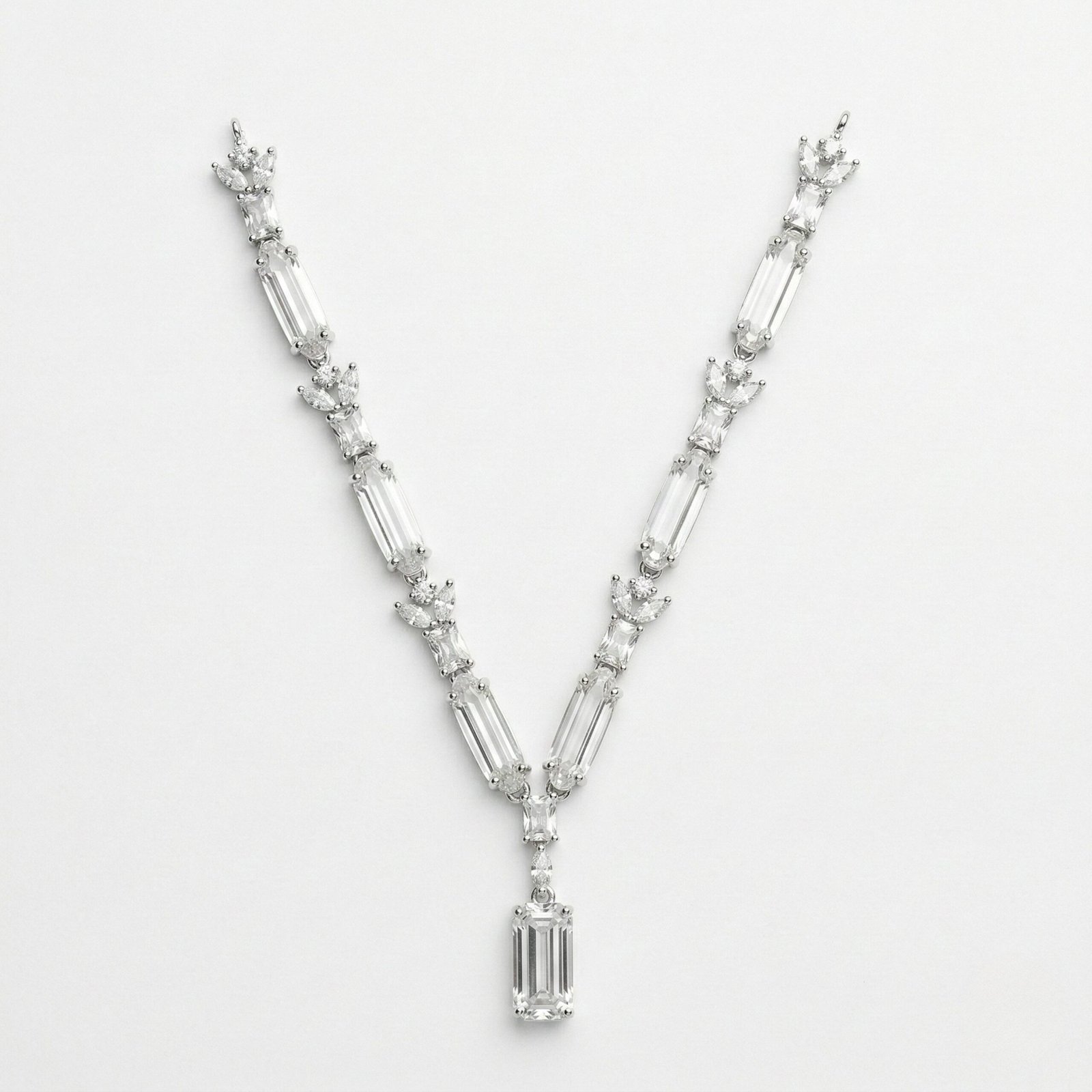 Each stone is precision-set to maximize light reflection, creating a luminous yet sophisticated finish. The structured crystal links gradually lead to an elongated emerald-cut drop pendant, adding movement and vertical elegance to the overall design.