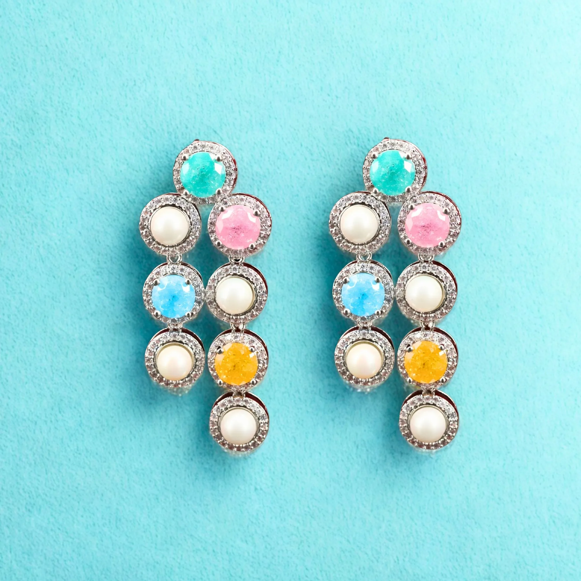 The Rineva Celeste Multi-Stone Drop Earrings are designed to bring together colour, elegance, and refined craftsmanship in a striking vertical silhouette. Featuring a series of round stones arranged in a cascading pattern, these earrings combine soft pastel hues with classic pearl tones to create a balanced yet eye-catching design.