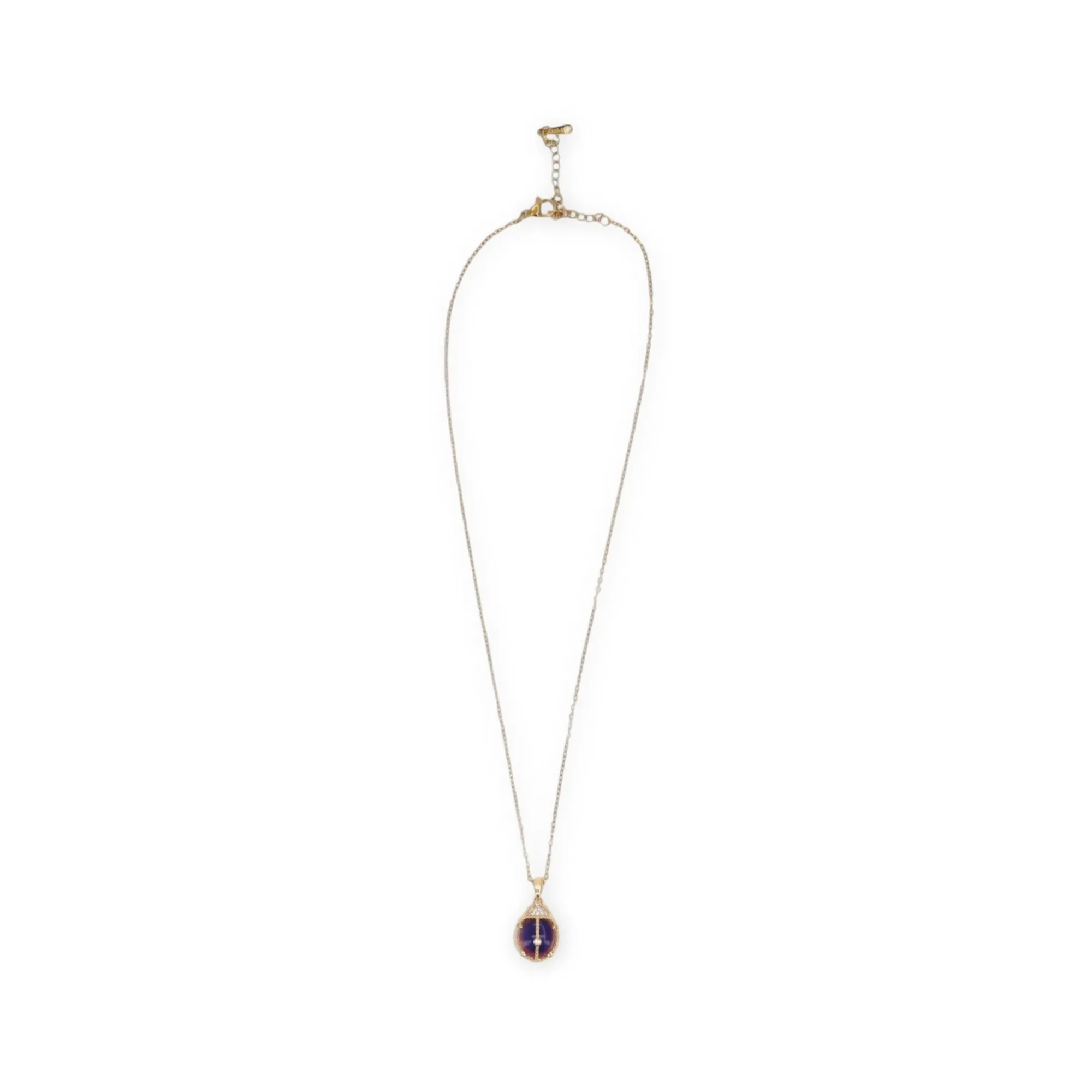 The centre stone is framed within a gold-tone setting, delicately outlined with subtle crystal accents that add just the right amount of sparkle. The oval silhouette softens the overall design, creating a timeless shape that flatters every neckline. A slim vertical accent detail through the centre adds balance and symmetry, giving the pendant a distinctive yet graceful character.