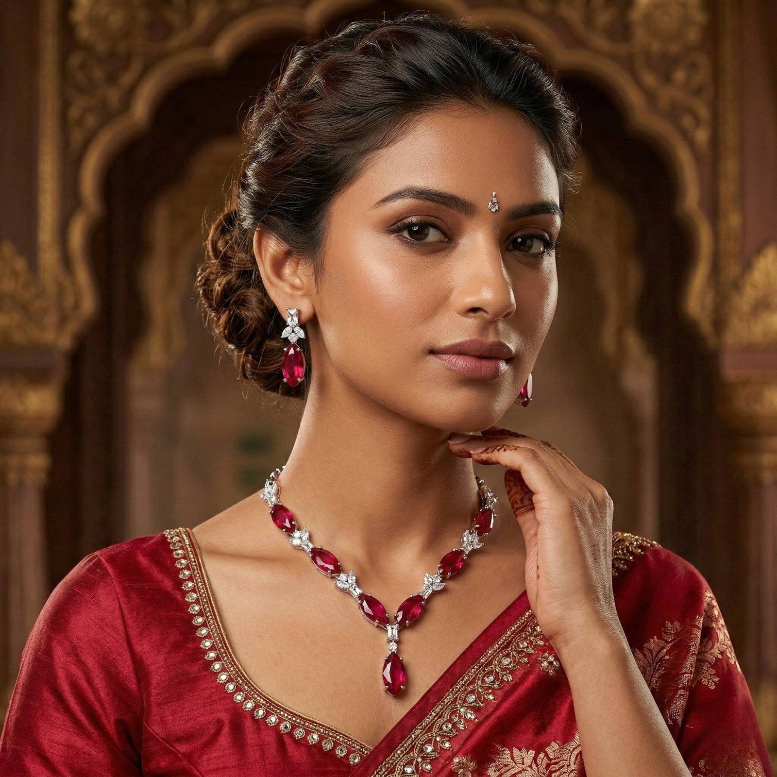 Each red stone is precisely faceted to enhance depth and light reflection, giving a luxurious gemstone-inspired appearance. The silver-tone base enhances contrast, allowing the crimson hue to stand out vividly — especially against silk, velvet, or embroidered festive wear.