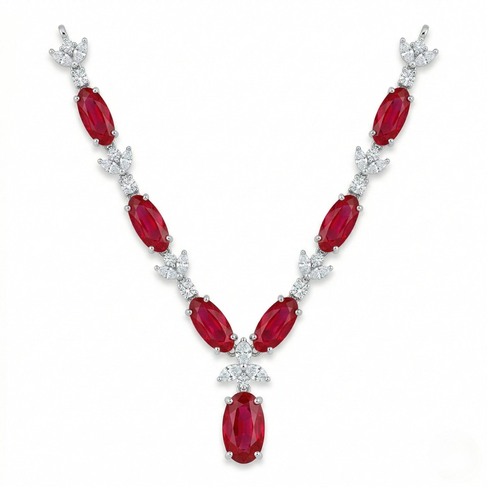 Featuring a sequence of rich deep-red stones framed with brilliant white crystal clusters, this design creates a regal rhythm across the neckline. The structured V-shape leads to a bold drop pendant that anchors the entire look with drama and balance.