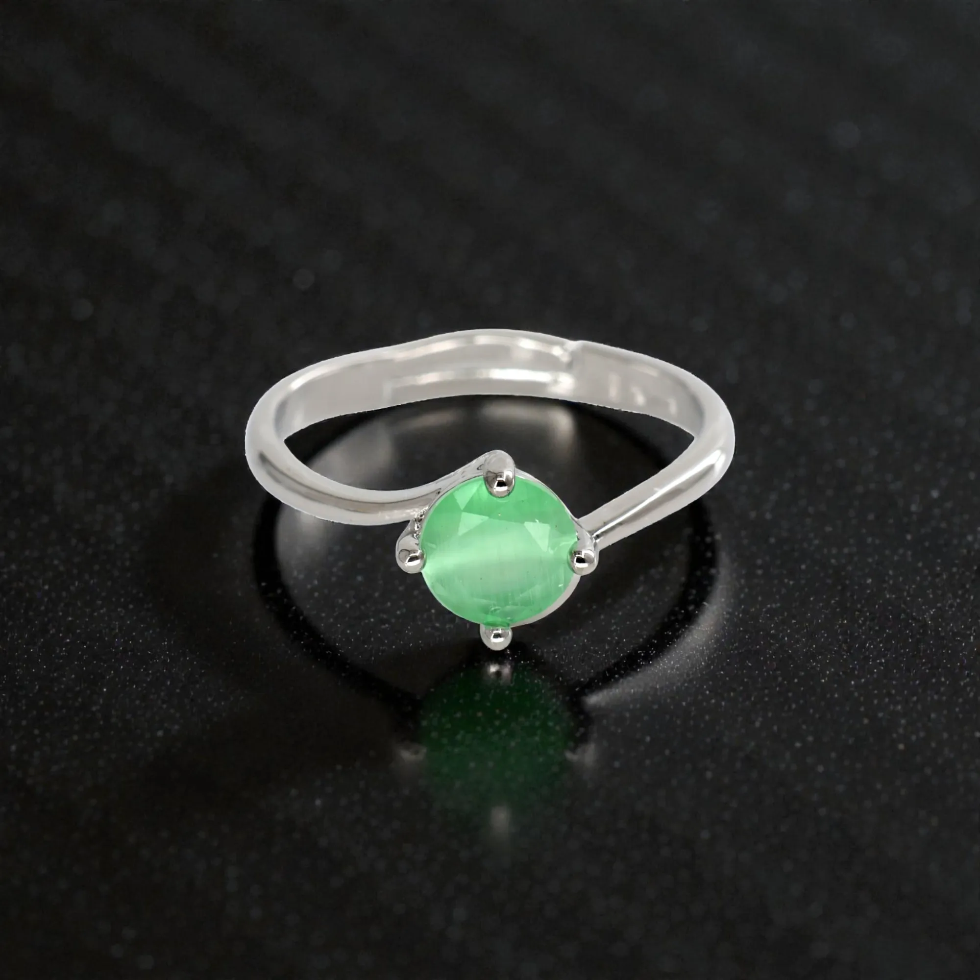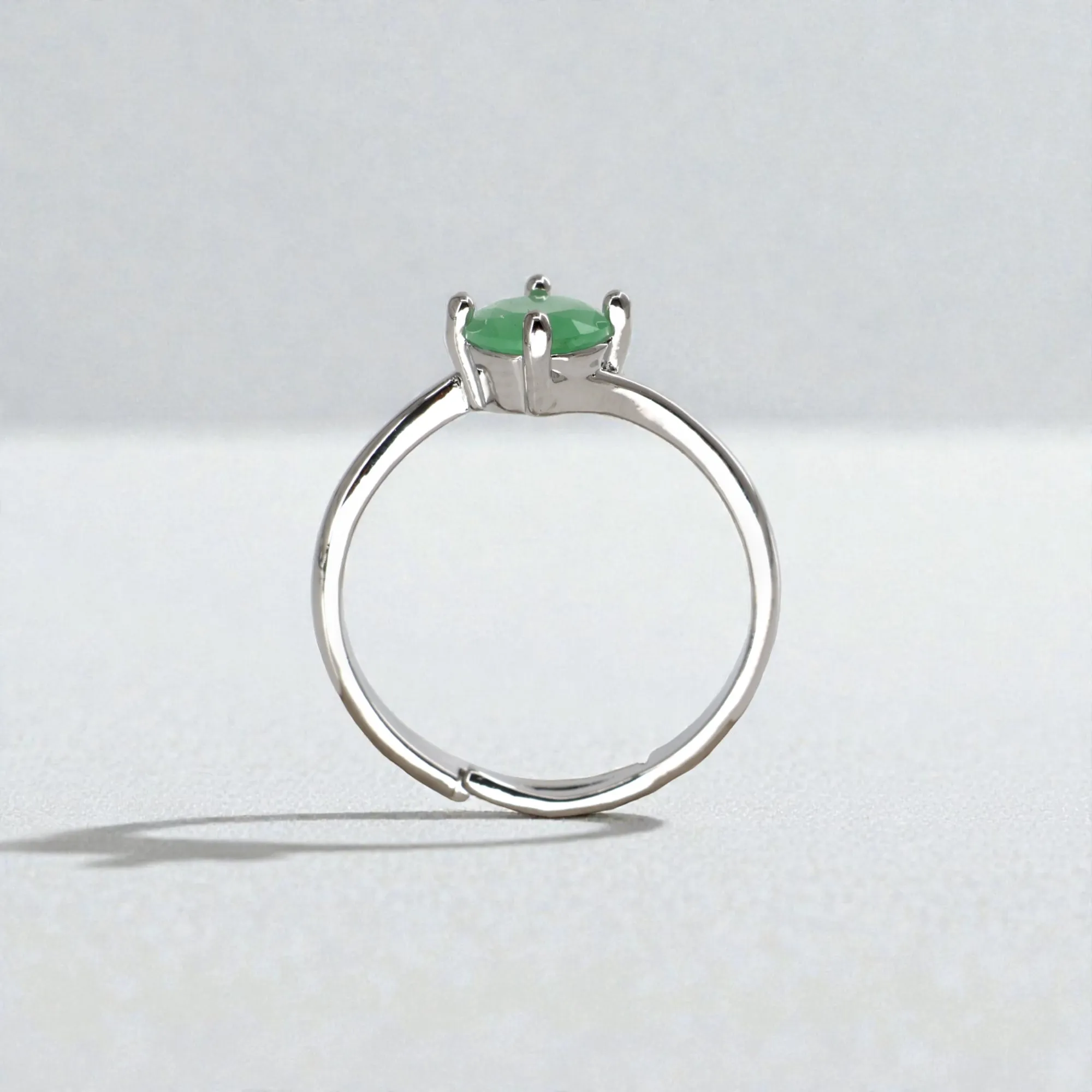 The Rineva Emerald Glow Silver Adjustable Ring is designed for those who appreciate simplicity with a touch of colour. Featuring a beautifully cut round green stone set in a classic four-prong mount, this ring delivers a graceful balance of elegance and modern minimalism.