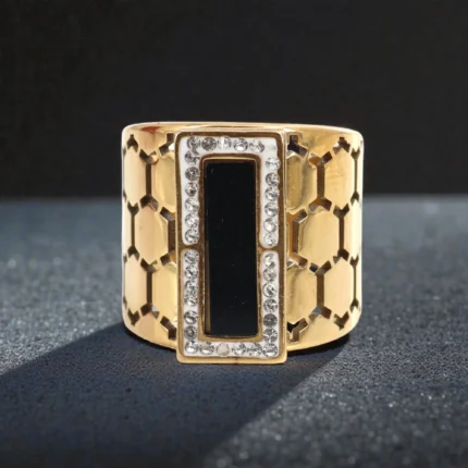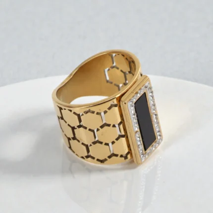 Designed with an adjustable open-band structure, this ring offers a comfortable and flexible fit, making it easy to wear for long hours without compromising on style. The slim band is accented with subtle crystal work, adding just the right amount of shimmer without overpowering the centerpiece.