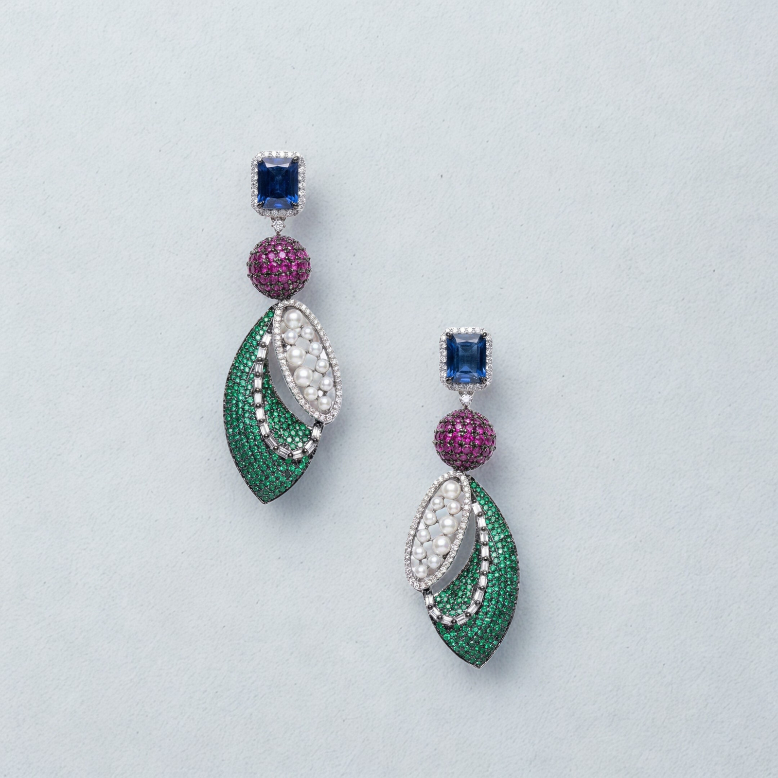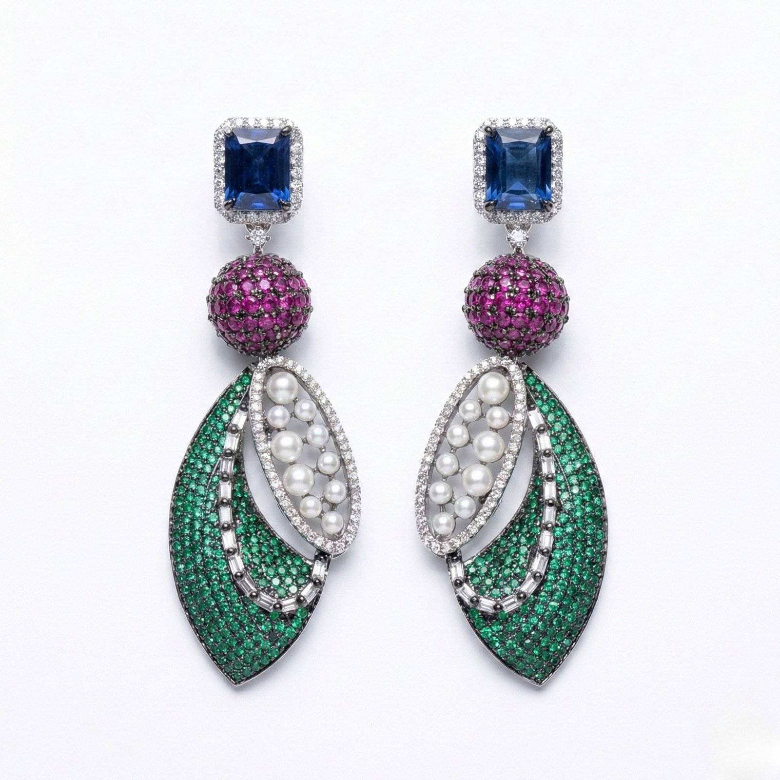 Bold emerald-toned leaf drop earrings with royal blue crystal studs