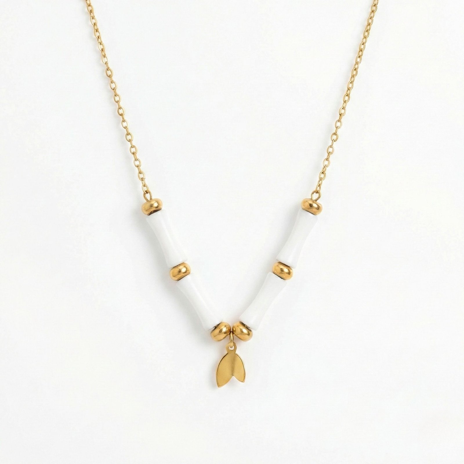 The Rineva Ivory Bloom Charm Necklace is a graceful blend of softness and sophistication. Designed in a flattering V-shape silhouette, this necklace features smooth ivory white tubular beads paired with polished gold-tone accents for a refined contrast.