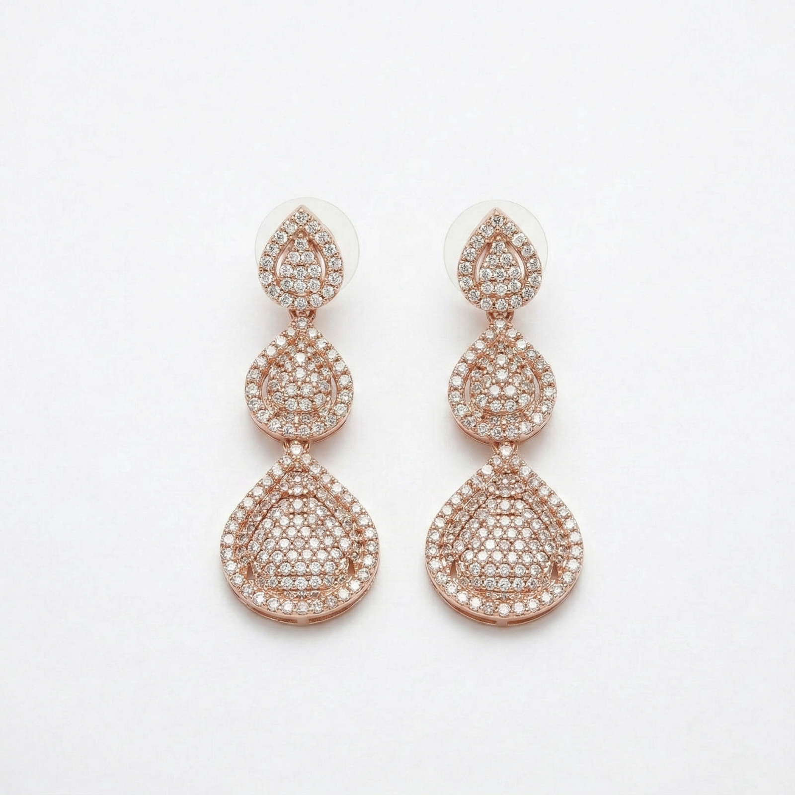 The matching multi-tier drop earrings replicate the pear-shaped motif, completing a cohesive and regal ensemble without overwhelming the overall look.