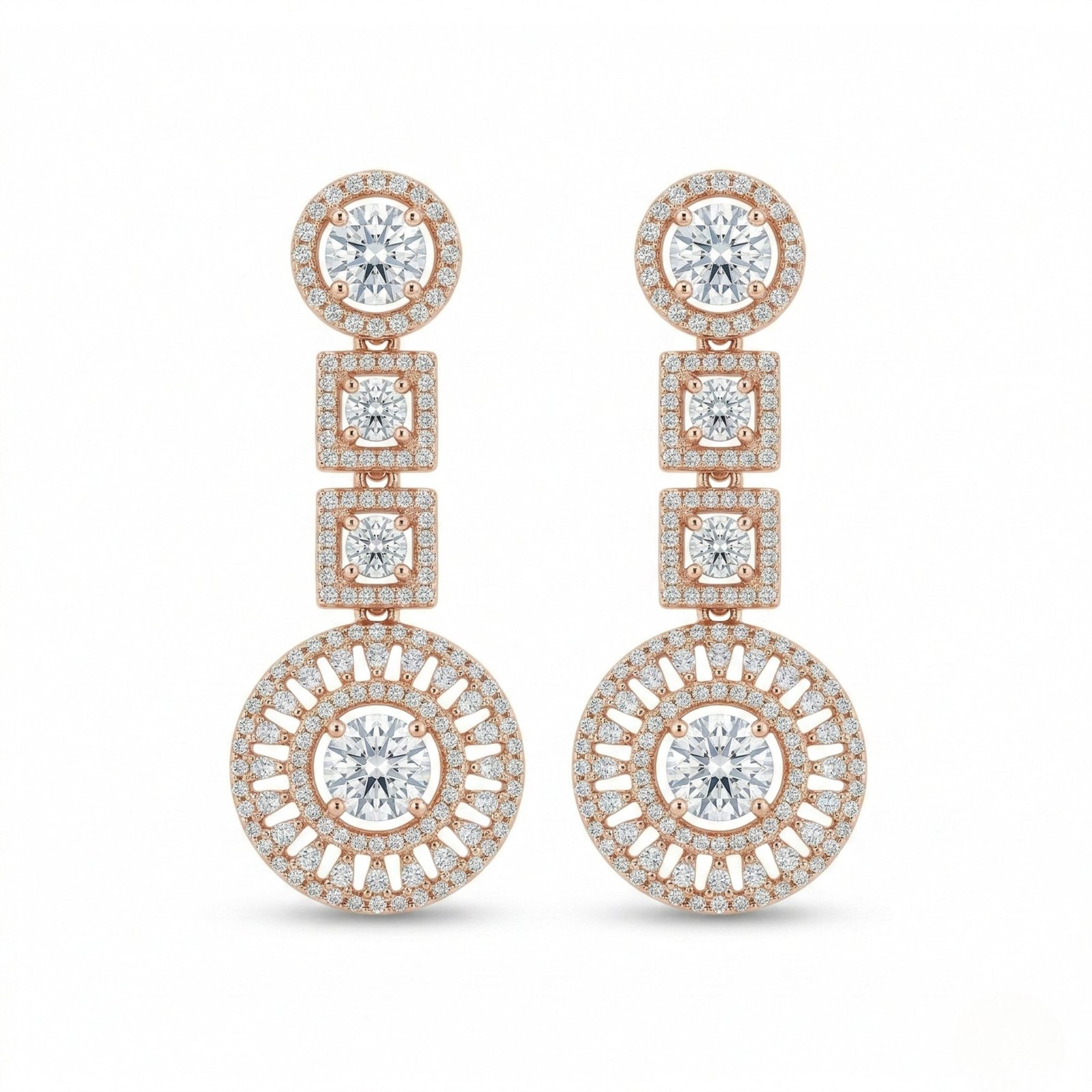 The Rineva Radiant Royale Pendant Necklace Set blends structured geometry with timeless brilliance. Designed with a sequence of cushion-shaped crystal frames, each motif is centered with a high-shine round stone and bordered by delicate pavé detailing that enhances depth and sparkle.