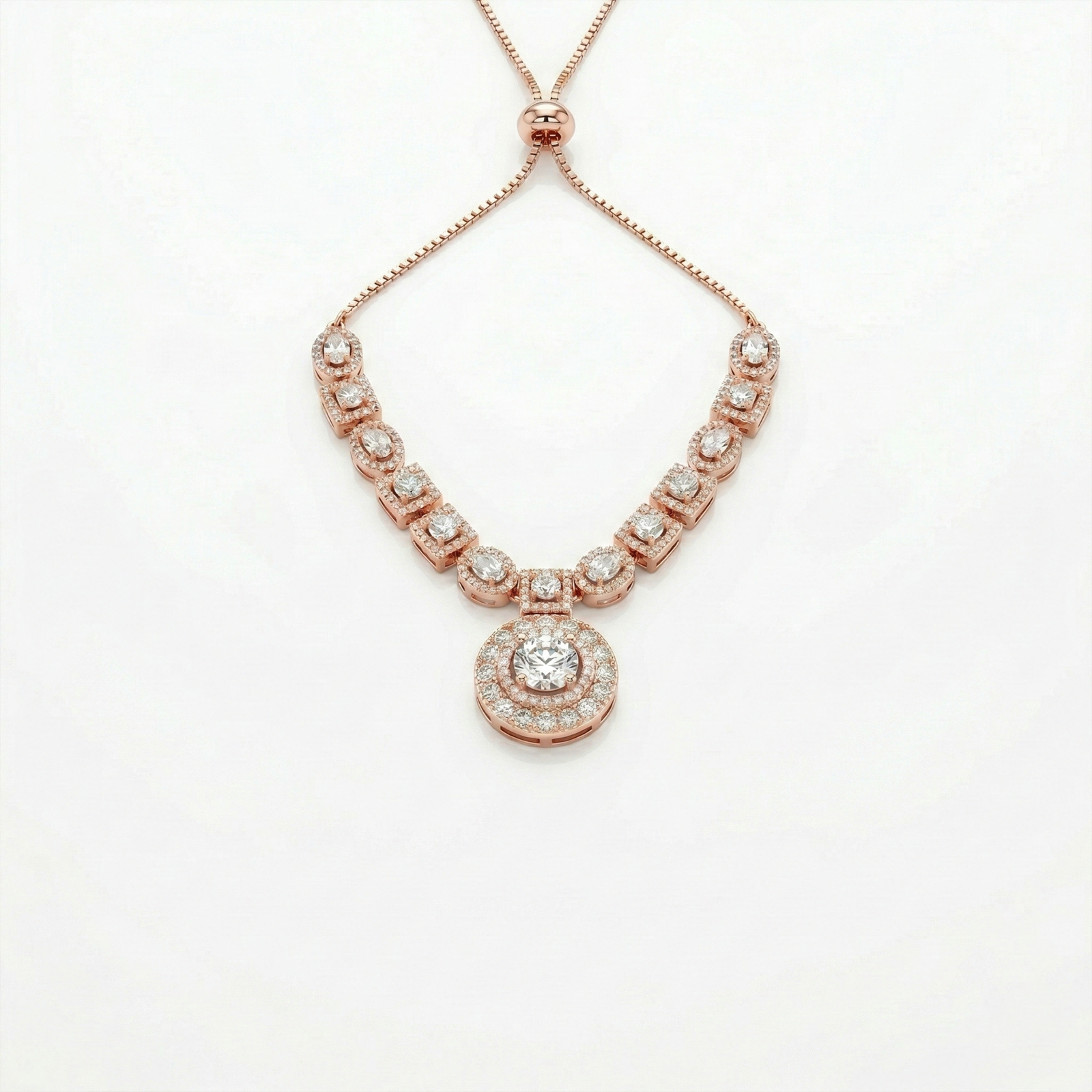Crafted in a warm rose-gold finish, the polish enhances the brilliance of the stones while maintaining a refined and modern aesthetic. The adjustable slider chain ensures a comfortable and customizable fit for different necklines.