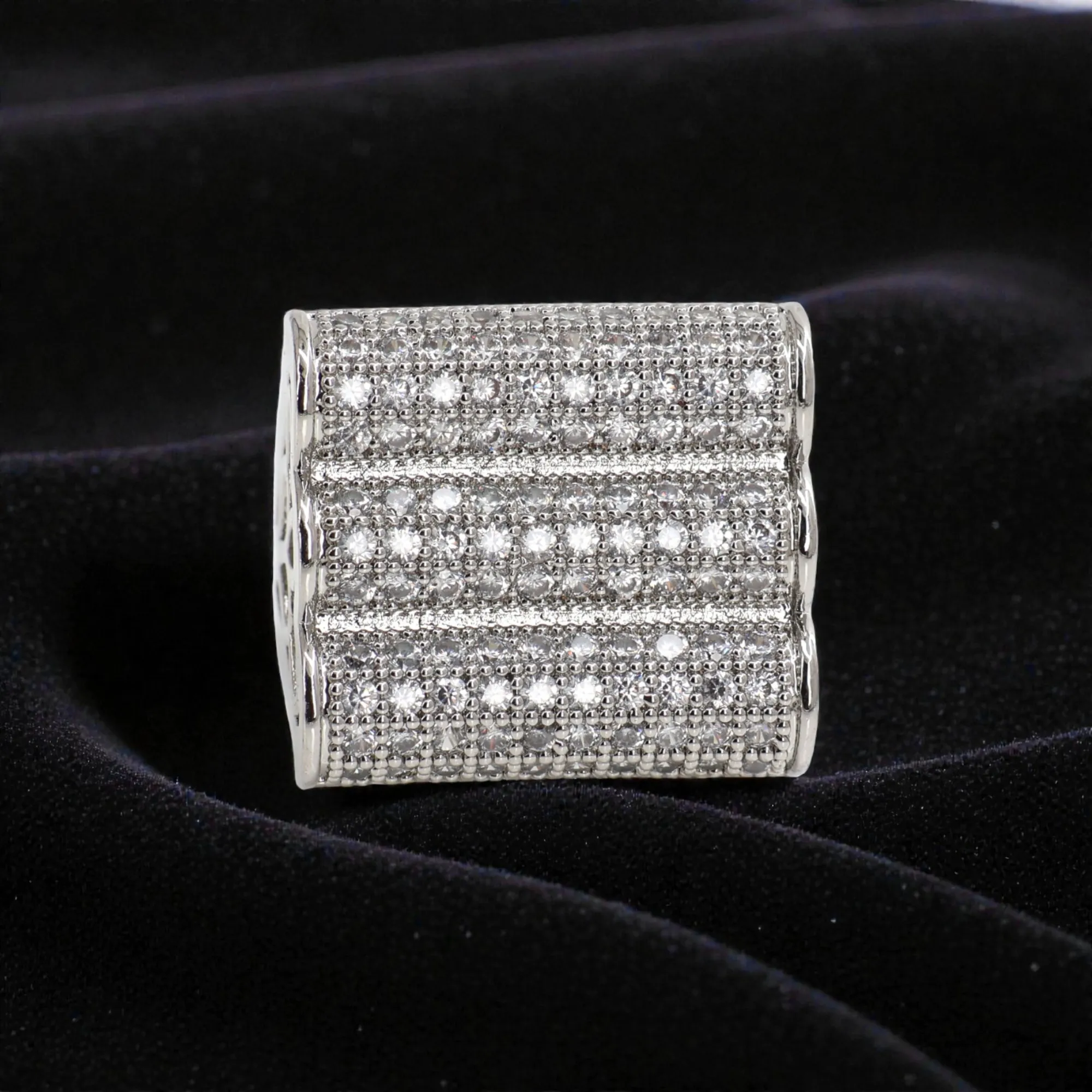 Its wide-band silhouette creates a powerful statement while maintaining comfort through a thoughtfully designed inner curve and openwork detailing. The intricate pavé setting enhances light reflection, giving the ring a rich, diamond-like sparkle that elevates both contemporary and traditional outfits.