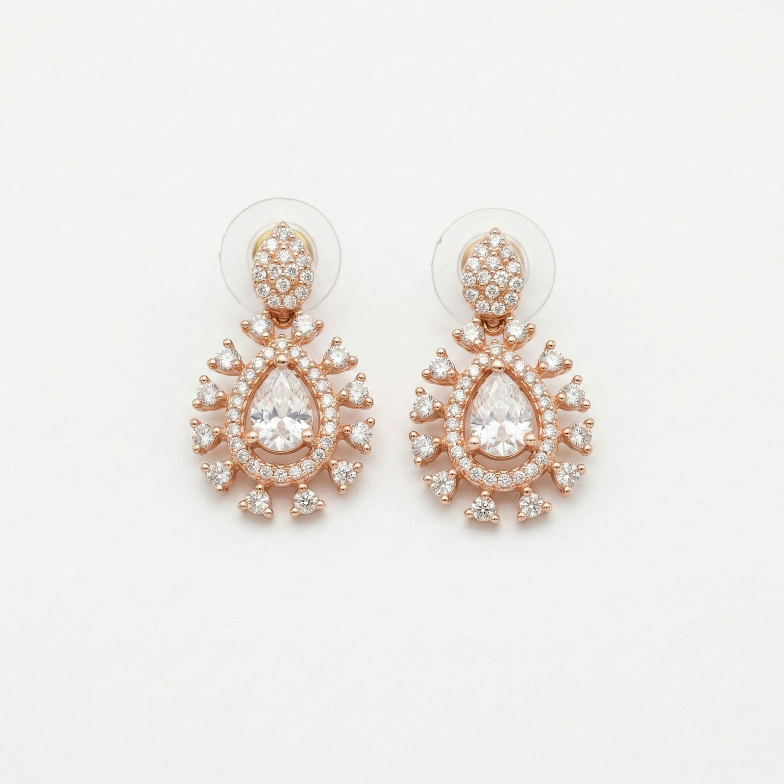 The matching drop earrings mirror the floral silhouette, featuring a pear-cut center stone framed by radiant pavé accents. Together, the set delivers balanced sparkle suitable for festive gatherings, engagement functions, cocktail evenings, and wedding celebrations.