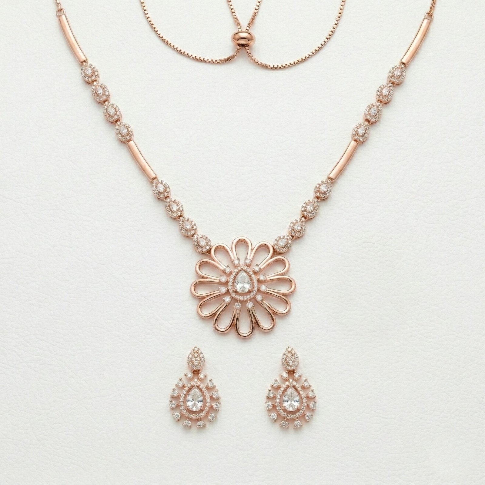The Rineva Rosé Bloom Crystal Pendant Necklace Set is designed for women who appreciate graceful detailing with soft feminine brilliance. Inspired by blooming floral motifs, the pendant features a pear-cut crystal centerpiece surrounded by delicately sculpted petal forms.