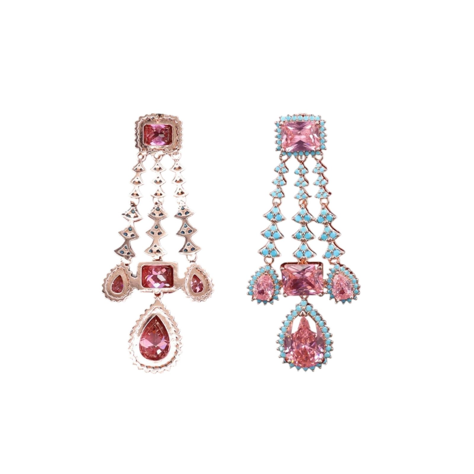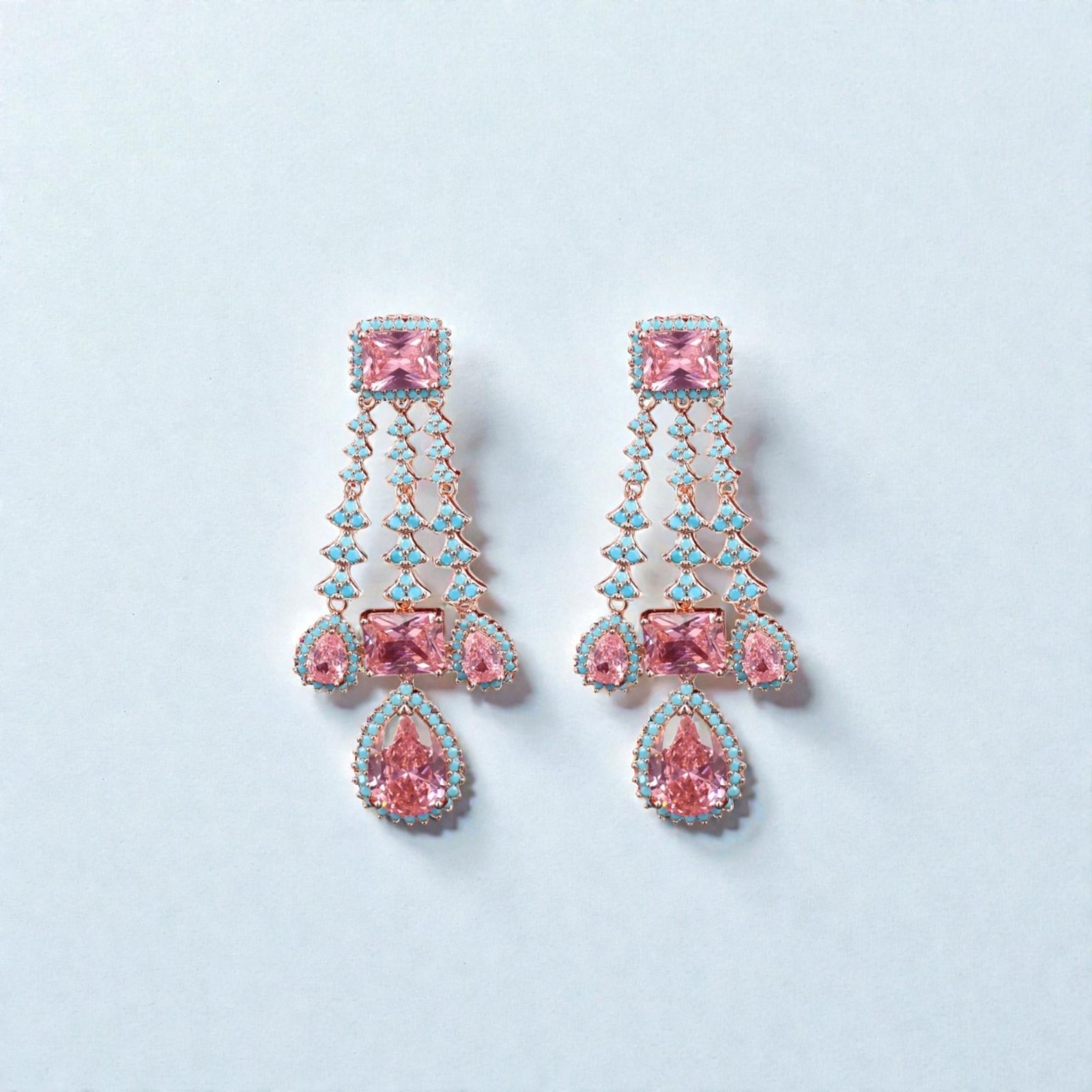 The Rineva Rosé Cascade Chandelier Earrings are crafted for moments that demand attention and elegance. Designed with a harmonious blend of soft blush pink stones and delicate turquoise accents, these earrings create a striking balance between bold glamour and refined detail. The rose-gold toned base enhances the warmth of the stones, making the piece visually rich without appearing overpowering.