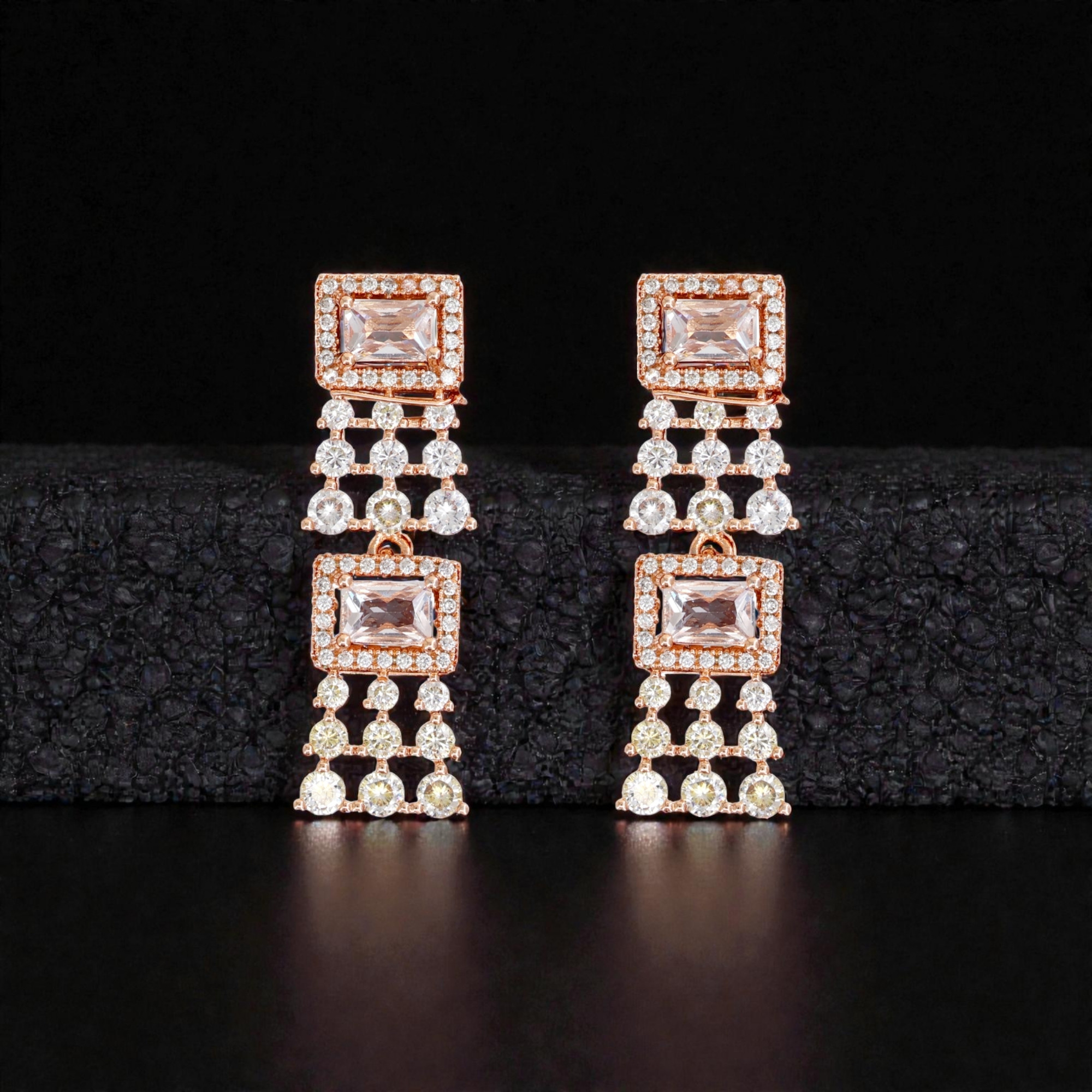 Paired with matching drop earrings, the set maintains a harmonious balance of sophistication and charm. The earrings mirror the square-stone design and layered crystal detailing, offering graceful movement and eye-catching shine from every angle.
