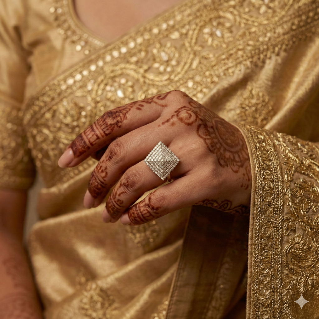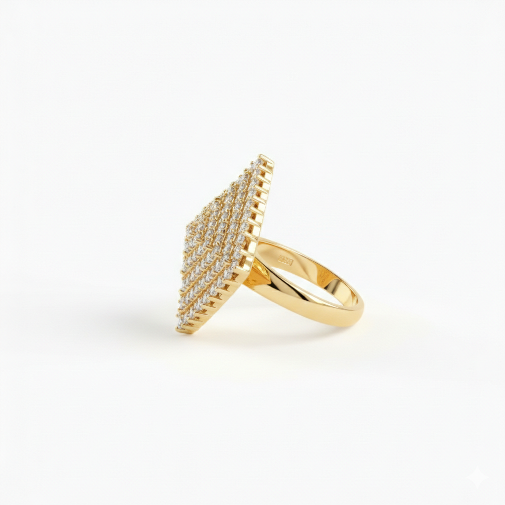 The Rineva Royal Lattice Diamond Statement Ring is crafted for women who prefer jewellery that commands attention. Designed in a striking diamond-shaped silhouette, this ring features a beautifully layered crystal grid that creates depth and symmetry.