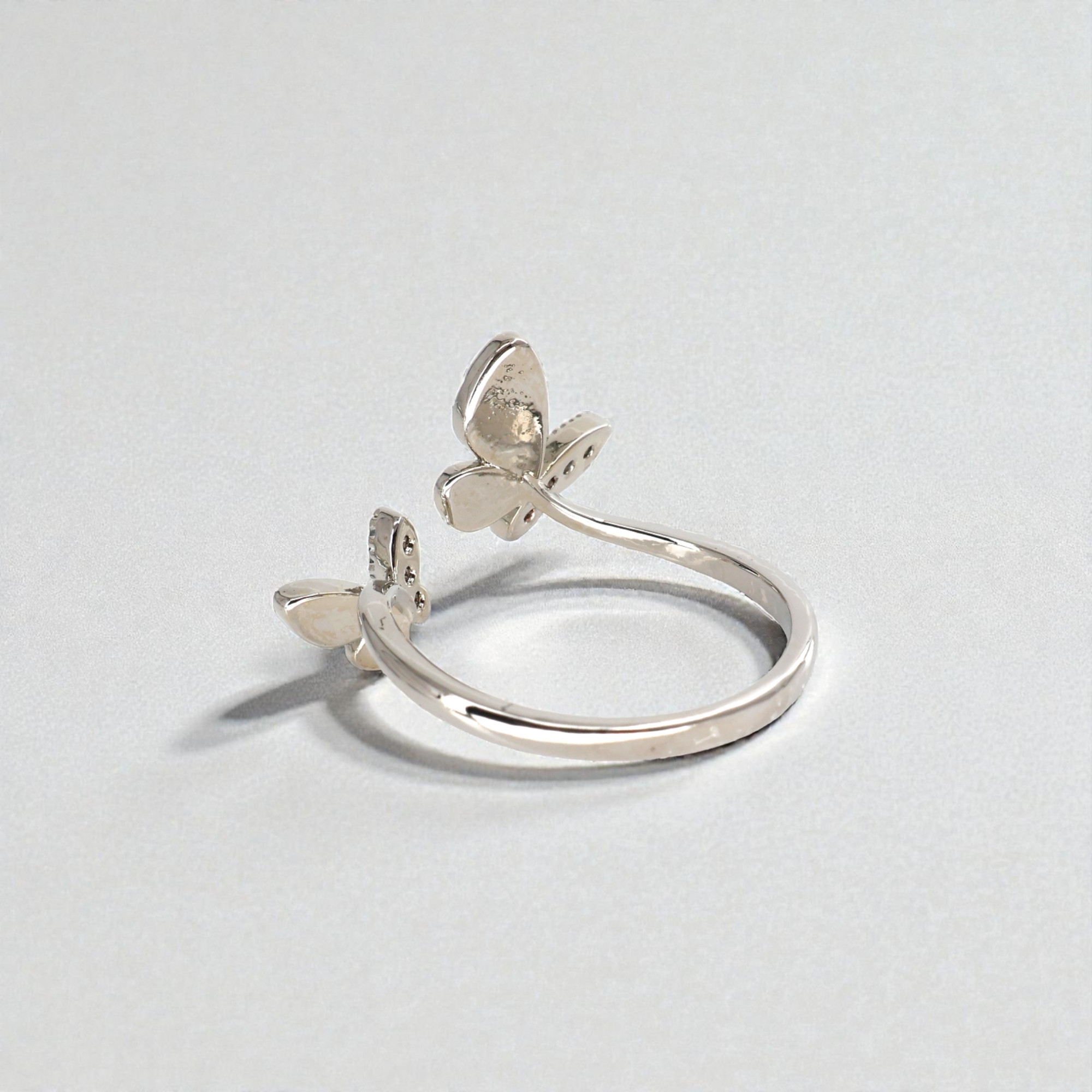 Crafted with a sleek polished silver finish, the butterfly elements are enhanced with shimmering clear stones that add a soft sparkle without overpowering the design. The open adjustable band ensures a comfortable and flexible fit, making it suitable for different finger sizes.
