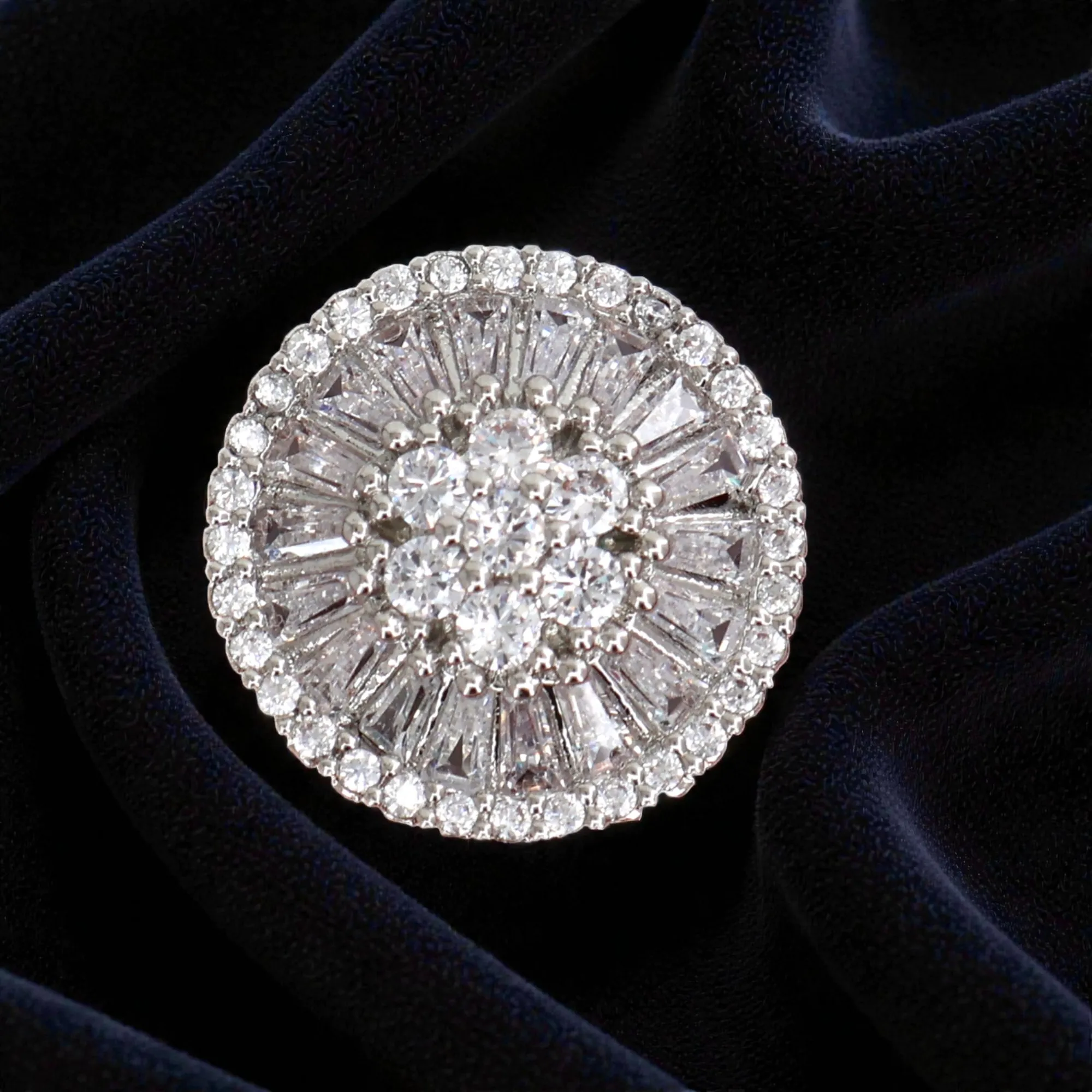 Surrounding the center cluster is a carefully arranged layer of baguette-cut crystals, radiating outward to create a sunburst effect. A delicate halo of round stones completes the design, adding depth, dimension, and luxurious brilliance from every angle.
